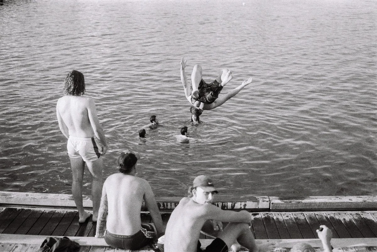 Girls wave from the pier. Guys circle below like sharks. One guy stops. She jumps. Quick talk. Straight onto the jet ski. Her arms wrap around him immediately. Physical contact first. They take off fast, way too fast. And they spin and spin, everyone laughs. He circles back, pulls her in. A kiss and she’s back on the pier, returning to the crew cheering for her.